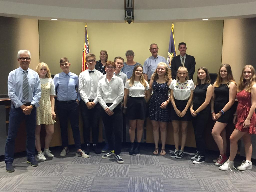 Eutin exchange students and their teacher/chaperone, Thomas Drexler, were introduced at a Lawrence City Commission meeting. They were welcomed to Lawrence by Mayor Lisa Larsen, and Commissioners Leslie Soden, Stuart Boley, and Matthew Herbert.
